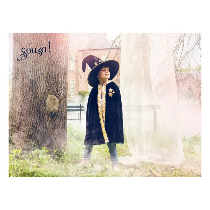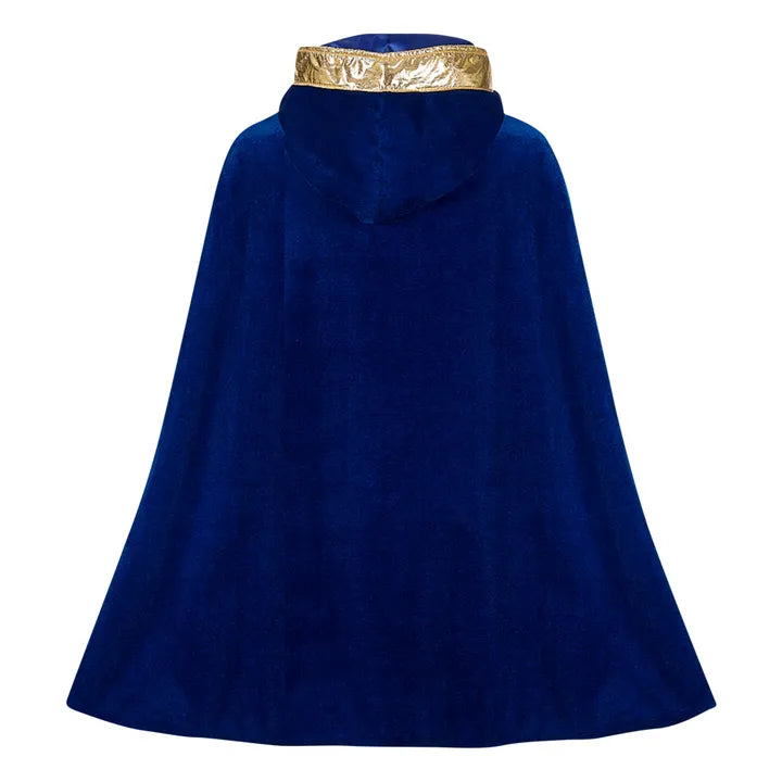 Wilfred - Magician Cape Beautiful Souza wizard cloak in navy velvet with fine gold stars on the left breast. The Souza cape closes on the front with practical velcro and has a soft, sewn-on hood. The cape has a lovely, blue satin inside and a wide gold edge in its opening at the front. The cape is made in a soft and delicious valor quality and is perfect for costume and everyday play.