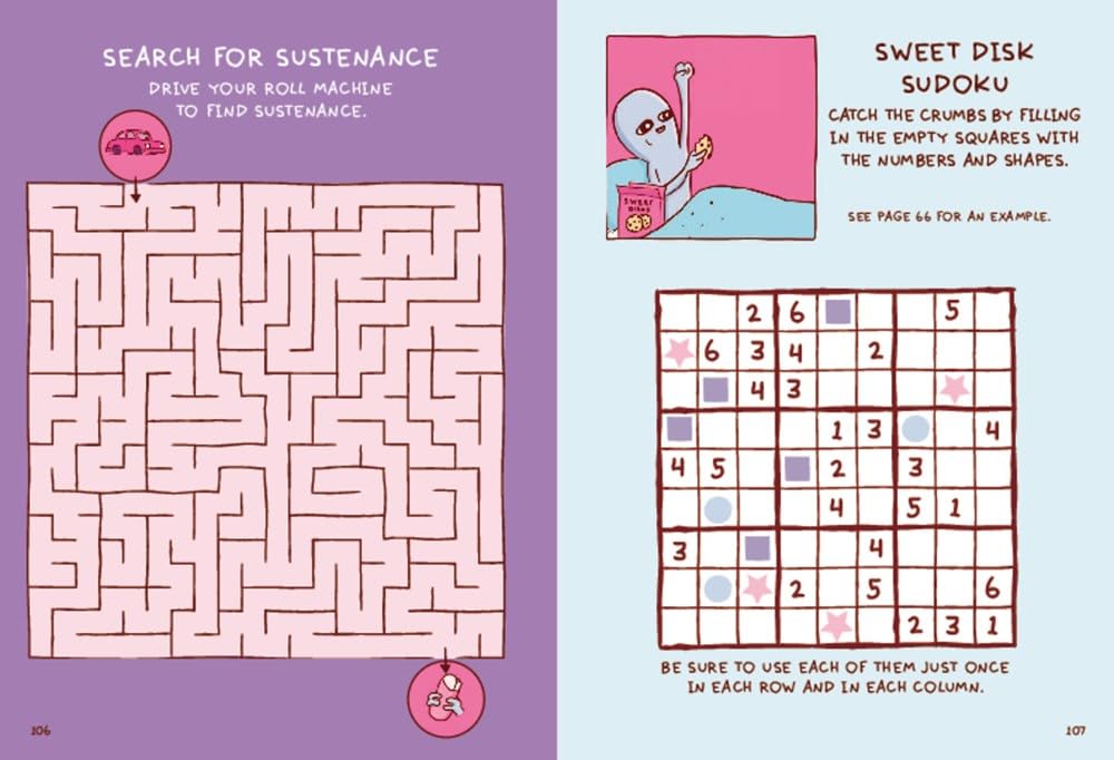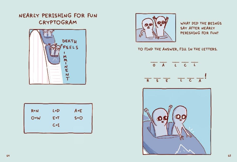 The book, filled with puzzles, games, and activities, features iconic big eyed, blue Beings, a bright pastel palette, and delightfully odd,deadpan humor. There are over one hundred pages to joyfully doodle in andcomplete, with activities ranging from crossword puzzles, mazes, word searches,matching games, spot the difference, and more.This activity book incorporates absurd “Strange Planet” lingo like “foot fabric tubes” (socks) and “vibratingcreature” (purring cat) throughout. Thisactivity book taps into what we love most about Strange Planet: the humor. Thisbook will give young fans of the Strange Planet series yet another opportunity to visittheir favorite blue Beings.