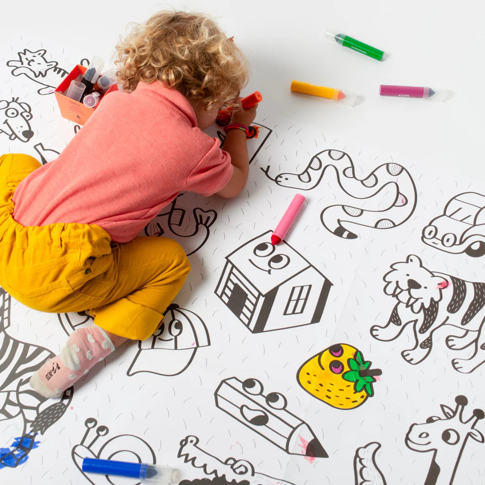 A giant poster with large illustrations, allowing the little ones to express their creativity with markers, wax crayons, or paint.