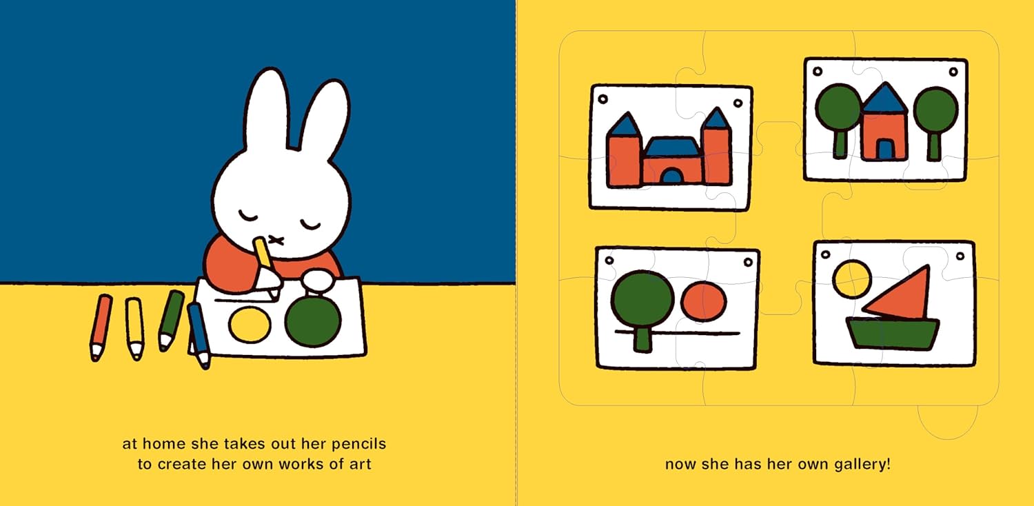 Miffy visits the gallery and sees lots of beautiful works of art. Feeling inspired, she uses her pencils to make her own artworks and creates her own gallery at home!The sturdy and big puzzle pieces with rounded edges are suitable for small hands. The six jigsaw puzzles in the book increase in difficulty, from four to nine pieces.