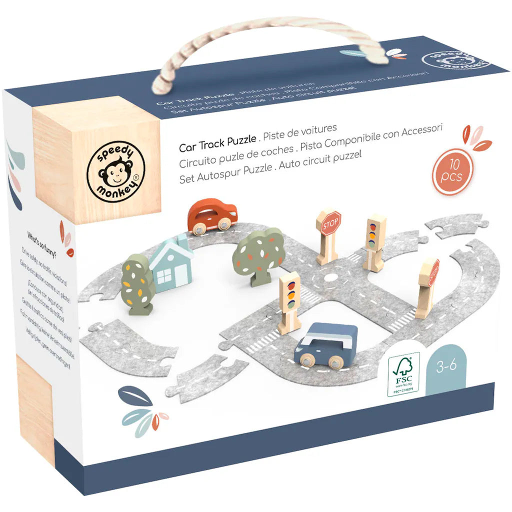Our Car Track Puzzle is not only a source of entertainment but also a great way to promote problem-solving skills and hand-eye coordination in children. The durable FSC Certified Wood from our certified supplier material ensures long-lasting use, making it a perfect addition to your little one's playtime collection. Puzzle track is made of gray felt.