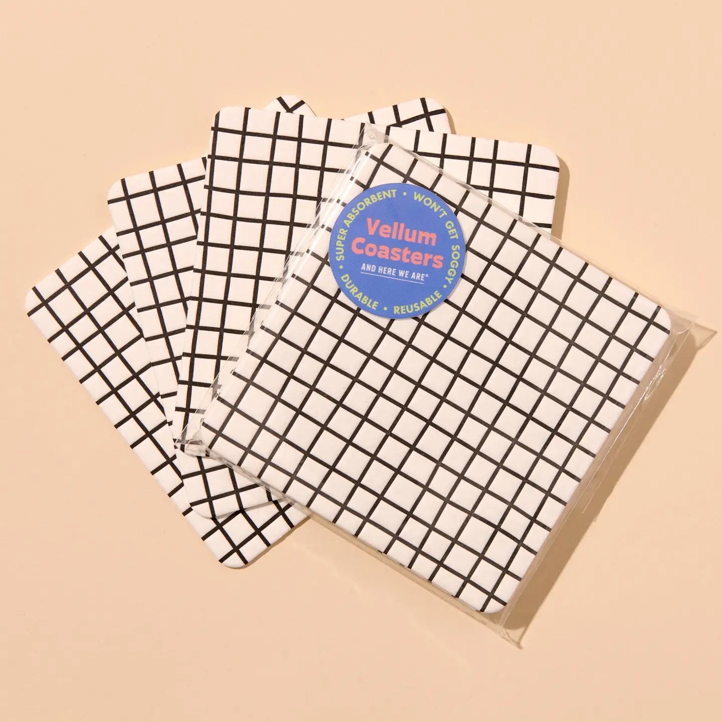 Set of 4 reusable, absorbent vellum coasters, letterpress printed. Excellent on their own or mixed and matched with our other coaster patterns. Perfect for game nights, cocktails, bar carts, and everyday hosting.