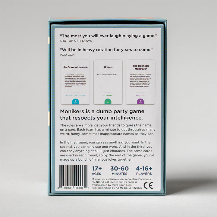 A party game in 3 phases. At the start of the game, you will receive a set of cards featuring names of famous and historical people. Your goal is to get your team to guess as many names as possible in the allotted time.