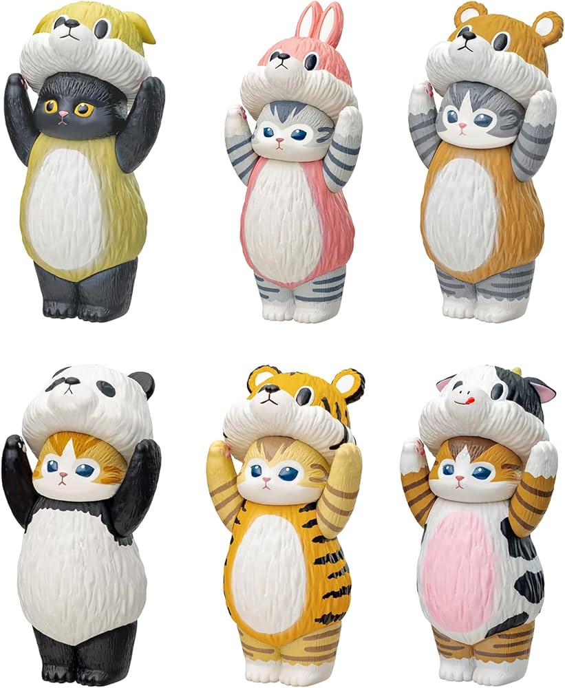 Stand tall with the Mofusand Soft Vinyl Collection Blind Box! This adorable set features upright-standing cats wearing cozy hoods shaped like various animals — think pandas, tigers, rabbits, puppies, and more! Made of soft vinyl and full of expressive charm, these figures are as satisfying to hold as they are to display.Standing approximately 3 inches tall, each cat figure is the perfect size to brighten up your shelf, workspace, or collection cabinet. With multiple unique designs to discover, each blind box brings a surprise burst of charm.