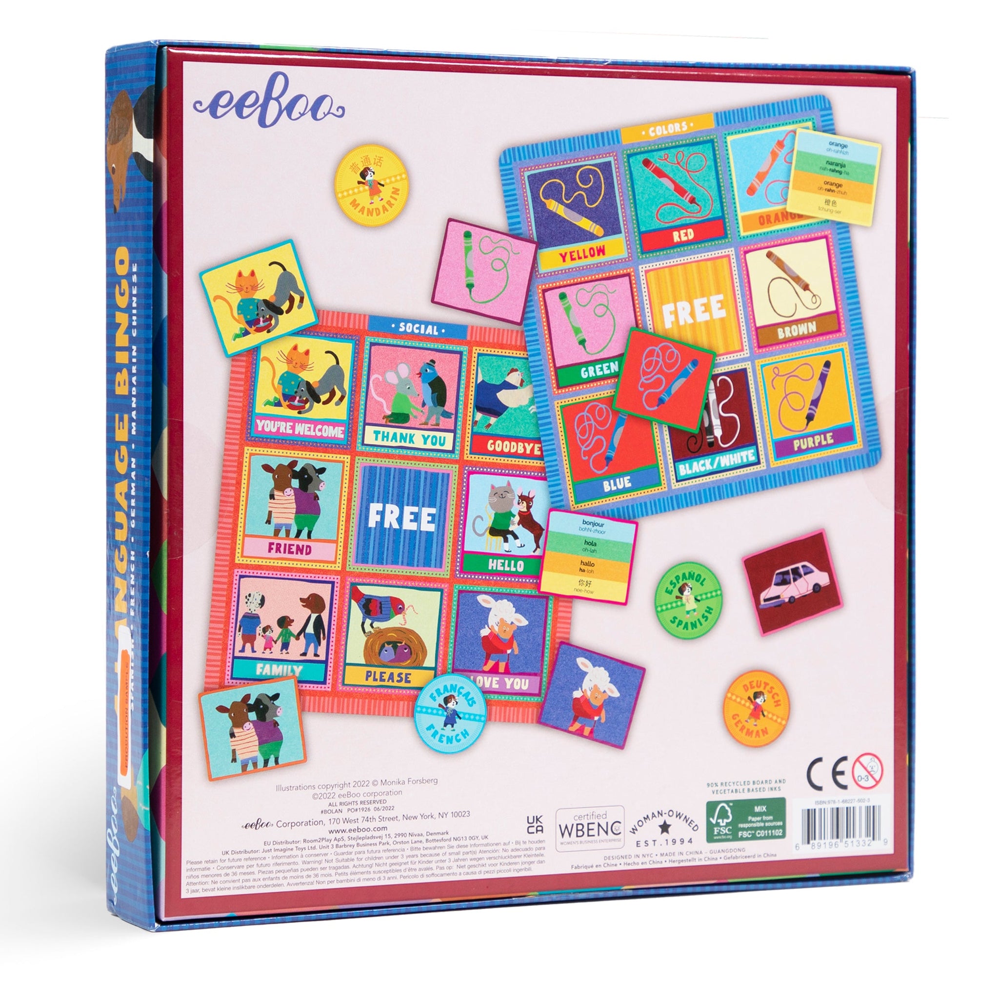 Build young brains through excitement and fun with this 4 Language Bingo game covering Spanish, French, German and Mandarin Chinese. Designed for ages 5+ and suitable for up to 6 players going head-to-head, this bingo set features beautifully illustrated everyday items covering a number of categories - food, clothes, numbers, colors, social terms and vehicles. Illustrated by Monika Forsberg.Play the game in one language or increase the challenge by switching between the 4 each time you pick an item token. The first to fill their card wins and proves their increasing knowledge!A handy pronunciation guide is also included so players, young and old, can perfect their delivery as they play.Skills: Listening, communication skills & vocabulary.Age: 5+Includes 6 game boards, 48 playing pieces and 4 language tokensIllustrator: Monika Forsberg