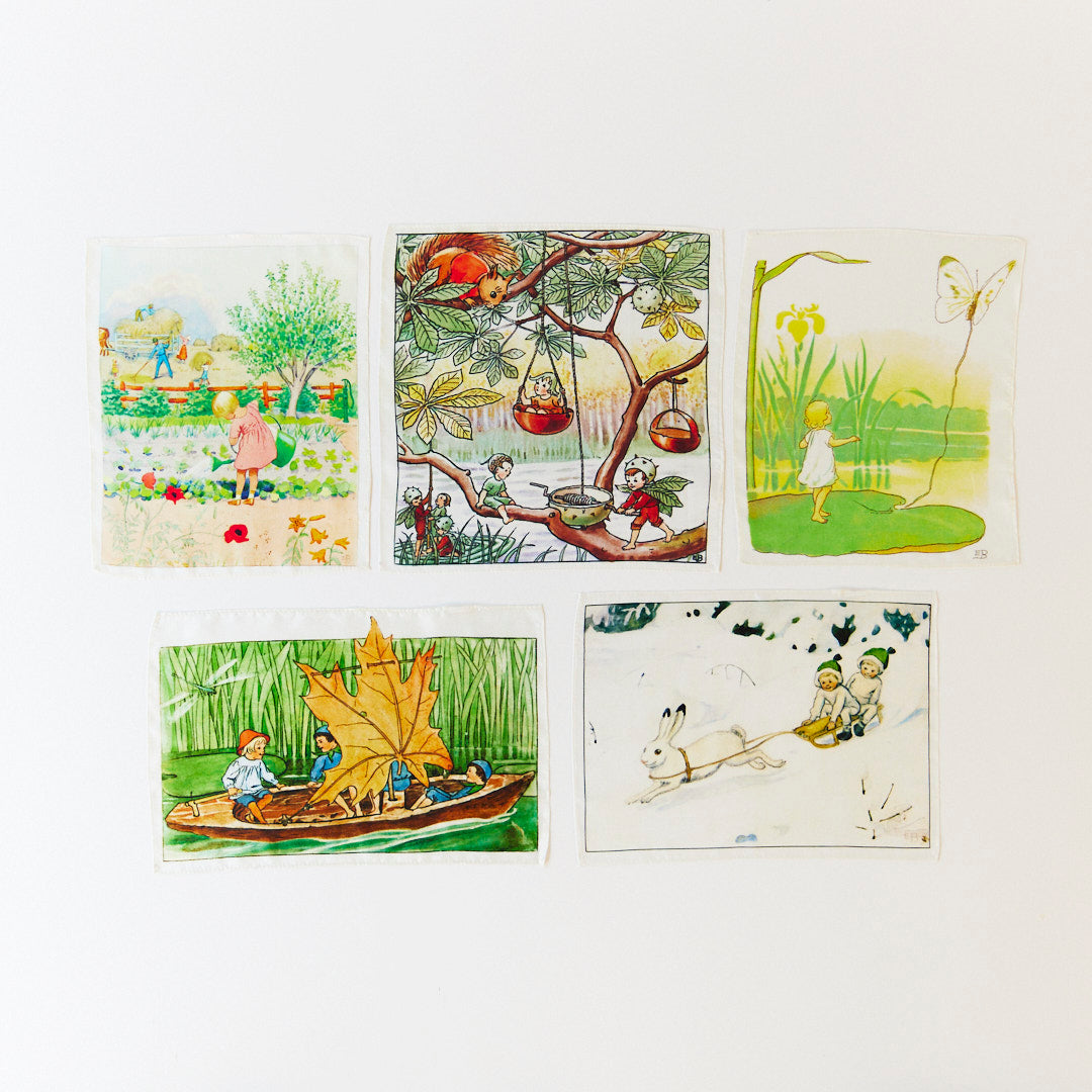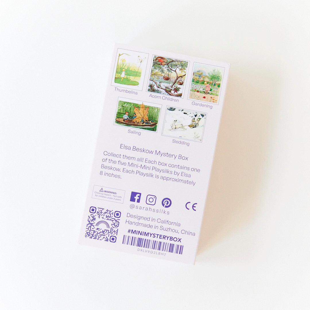 NEW Mini Mystery Boxes are a delight to open, each box contains one Mini-Mini Playsilk featuring charming illustrations inspired by Elsa Beskow's timeless stories. You will receive one Playsilk in a special Mystery Box, collect all 5! The scenes you may receive include Thumbelina, Acorn Children, Gardening, Sailing and Sledding.