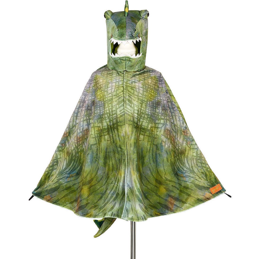Crafted from textured, scale-like fabric in bold dino green, it features a row of dramatic spikes down the back. The attached hood showcases fierce eyes and toothy details, instantly transforming its wearer into a stomping, roaring dinosaur. Easy to fasten and designed for maximum movement, this cape is perfect for jungle explorations and backyard dominion. For dino lovers and brave explorers alike, this cape brings the age of giants to life, one mighty roar at a time.