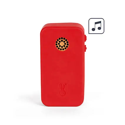 A ringing telephone just like the grown-ups! Telephone with sounds made from beech wood. It comprises 7 soft plastic sound keys: home key, email, alarm, ring, camera, settings and SMS. The telephone is protected by a silicone case. Gift box with inviolability stickers. Comes with 3 x LR44 1.5V batteries.