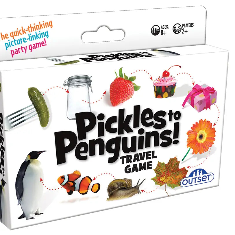 Pickles to Penguins is the perfect travel companion for your next adventure—whether you're on a cross-country road trip or just heading to grandma’s house down the street! This fast-paced, picture-linking game brings nonstop laughs and creative chaos to every journey. Race to connect quirky images—like a pink flower and a bumblebee. Maybe bees love flowers... or maybe they both just live outside! Your connections don’t have to be perfect—just convincing enough to win over the other players.